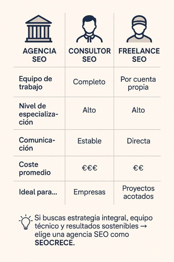 Un consultor SEO puede ser ideal para asesorías puntuales o proyectos pequeños, mientras que una agencia SEO como SEOCRECE ofrece un equipo multidisciplinar, procesos estructurados y soporte técnico integral, ideal para proyectos que buscan crecer a medio y largo plazo.